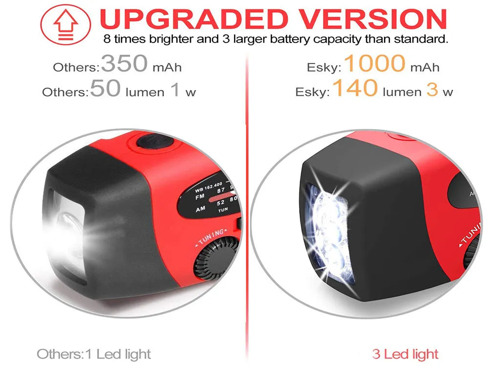 This portable emergency radio features AM/FM/NOAA weather channels with manual tuning and a built-in speaker. It offers multiple charging options, including hand crank, solar power, and USB, plus a built-in LED flashlight for added convenience. Made of durable ABS material, it’s perfect for outdoor adventures, power outages, and emergency kits.